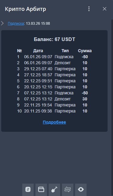 - Вывод: вывод накопленного партнерского бонуса (осуществляется внутренним переводом на бирже Bybit).