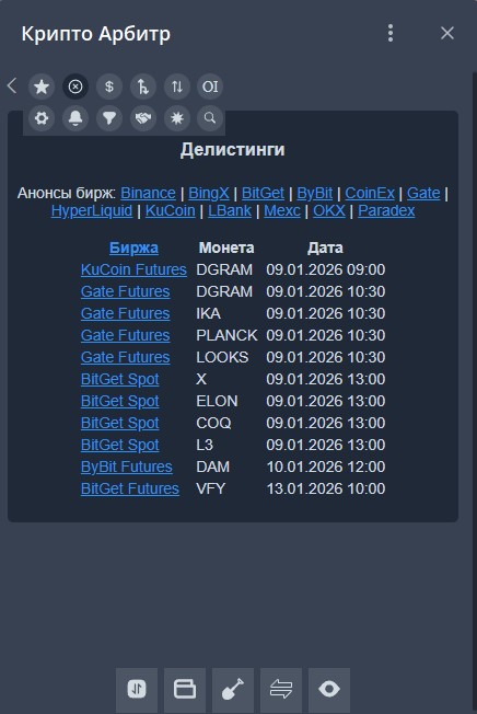 В данном разделе содержатся данные о токенах, которые в ближайшее время будут делиститься с бирж. Приводятся названия бирж со ссылками на монеты, названия монет и планируемое время делистинга. Далеко не все биржи через свои API сообщают о делистинге монет. Чтобы ознакомиться с полным списком бирж, которые это делают, нужно нажать на заголовок Биржа.