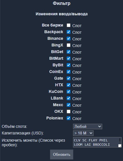 Фильтр для данной категории позволяет выбрать спотовые биржи, минимальный суточный объем торгов, минимальную капитализацию монет и определить список исключенных монет.
