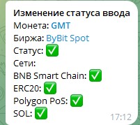 Уведомления данной категории необходимы, чтобы получать своевременную информацию об изменениях возможностей ввода/вывода монет на ту или иную биржу, так как зачастую данные события влияют на появление арбитражных ситуаций. Например, при закрытии возможности ввода монеты на какой-либо биржи ее курс частично отвязывается от глобального курса на данный токен и может в какой-то момент вырасти относительно цен на остальных биржах. Курс обязательно сравняют, как только возможность ввода этих монет будет открыта.