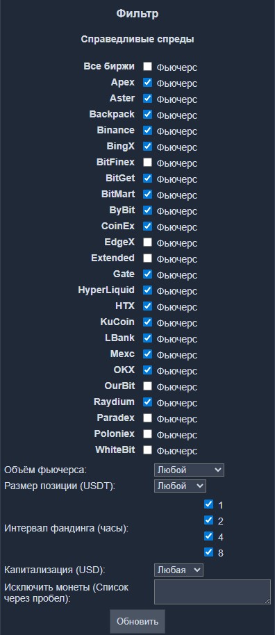 Фильтр для данной категории позволяет выбрать биржи, минимальный суточный объем торгов, минимальный размер позиции, желаемые интервалы фандинга, минимальную капитализацию монет и определить список исключенных монет.