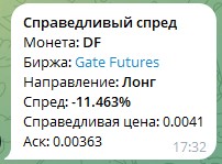 Пример уведомления о связке по справедливому спреду. Ссылка с названием биржи открывает нужную монету на бирже. Указывается направление предполагаемой позиции (Шорт или Лонг). Также приводятся название монеты, текущий спред между справедливой ценой и лучшей ценой аск или бид, справедливая цена (цена маркировки).