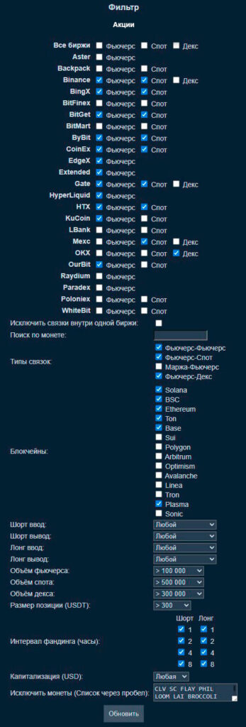 Фильтр для данной категории позволяет выбрать биржи, типы связок, блокчейны, минимальный суточный объем торгов, минимальный размер позиции на фьючерсах, желаемые интервалы фандинга, минимальную капитализацию монет и определить список исключенных монет. Также есть возможность указать статусы ввода/вывода монет и конкретную монету, чтобы связки отслеживались исключительно для нее.