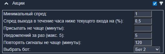- Спред выхода в течение часа ниже текущего входа на (%): если значение определено, то получать связки только, если спред входа в связку был ниже текущего на указанное значение;
