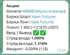 Пример уведомления о связке по акциям. Ссылка с названием монеты открывает трекер по данной монете. Также приводятся текущие значения спреда входа и выхода, фандинга с интервалами выплат, лимита позиции на фьючерсе и статусы ввода/вывода при наличии данных.