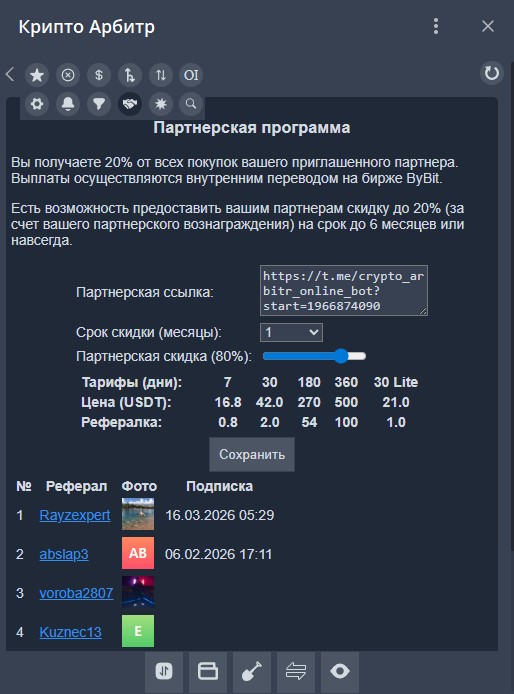 Партнерская программа позволяет зарабатывать 20% от всех покупок ваших приглашенных партнеров. Выплаты осуществляются внутренним переводом на бирже ByBit.